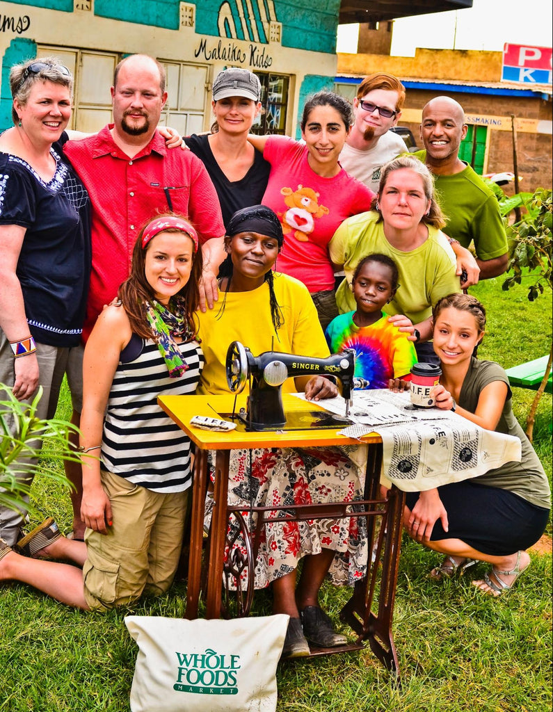 Women and community members collaborating around a sewing machine in an outdoor Kenyan setting, illustrating communal empowerment and skill sharing.