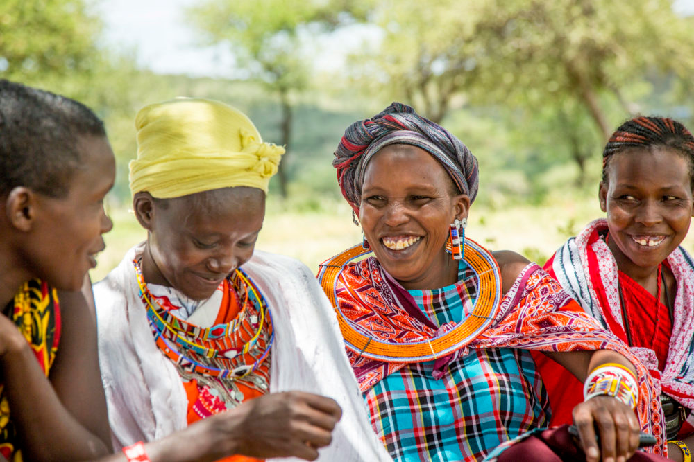 Kenyan women dressed in traditional attire illustrating communal bonds and cultural heritage linked to Ubuntu values.