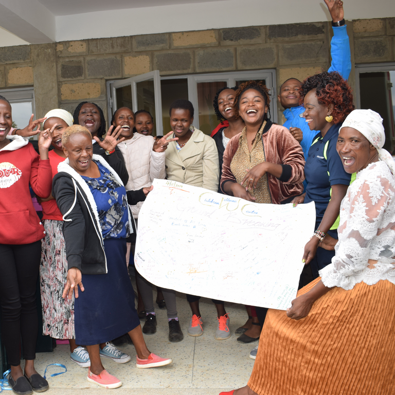 A group of women engaged in community work, holding a collaborative poster illustrating collective efforts inspired by Ubuntu values in Kenya.