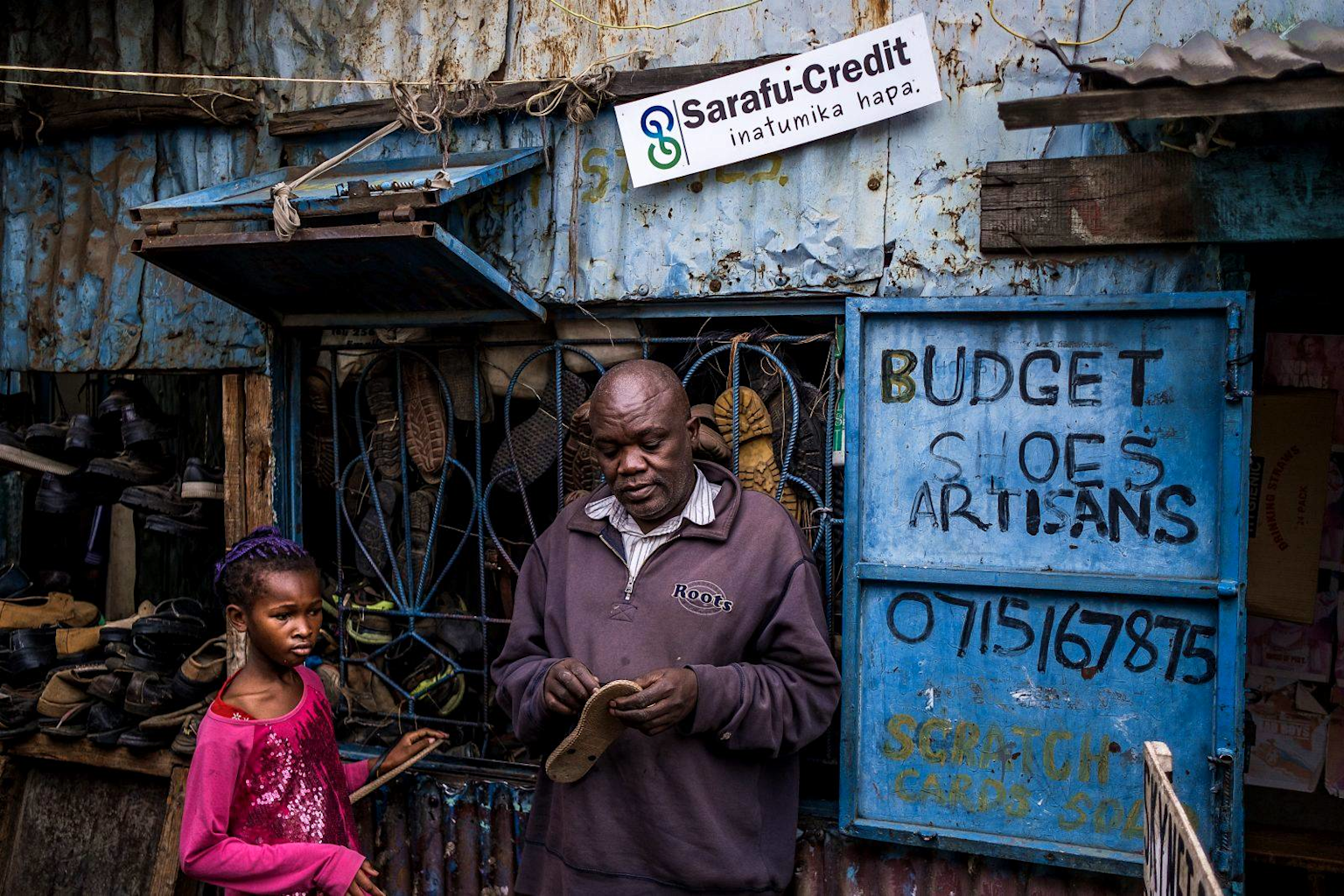 Sarafu community currency accepted at a local shoe artisan shop in Kenya supporting grassroots economic activity.