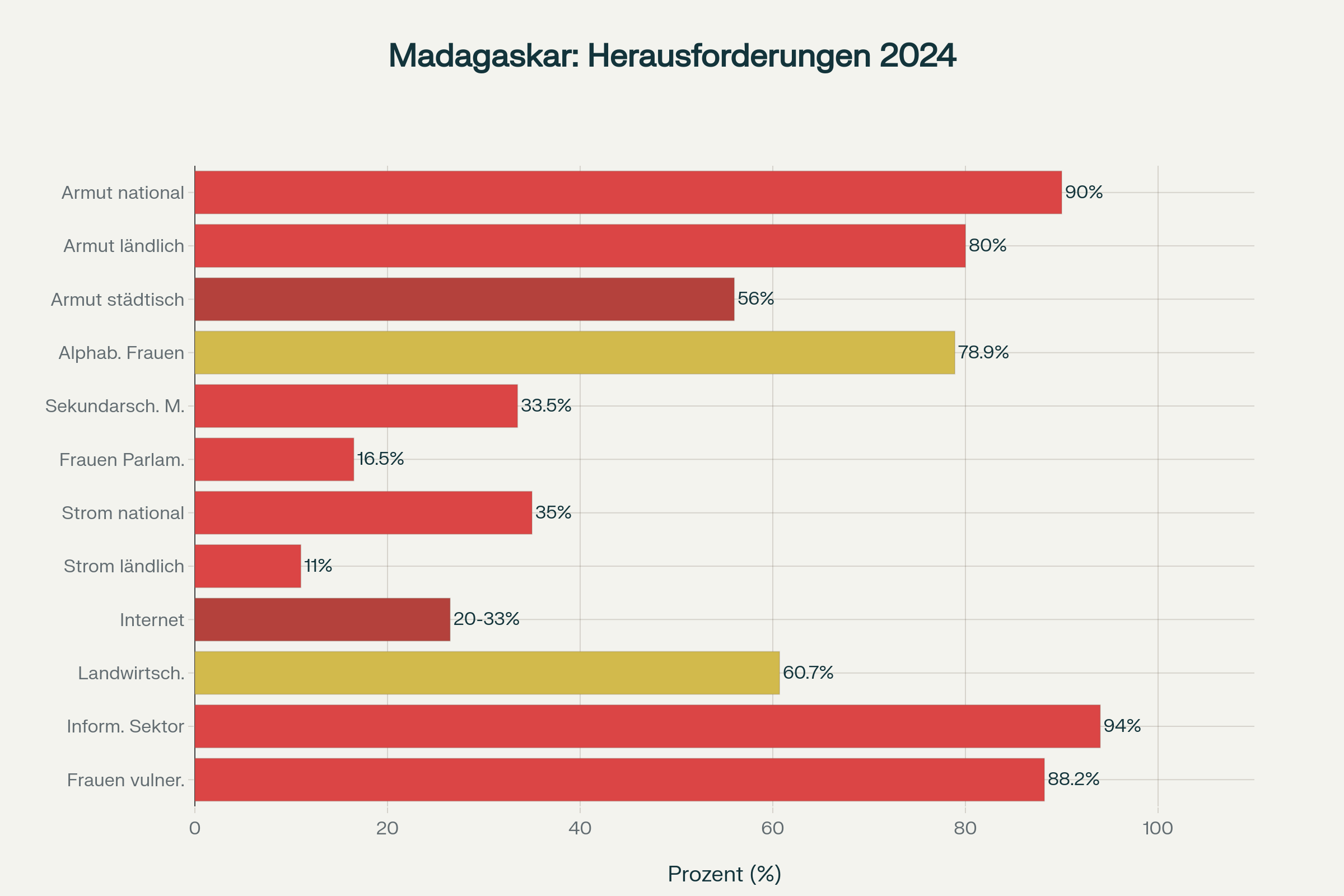 Madagaskar steht vor enormen Herausforderungen: 90% der Bevölkerung lebt in Armut, nur 11% der ländlichen Bevölkerung hat Zugang zu Elektrizität, und 94% arbeiten im informellen Sektor. Gleichzeitig zeigen sich Potenziale wie die relativ hohe Alphabetisierungsrate bei Frauen.